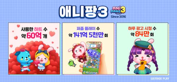 위메이드플레이는 출시 9주년을 맞은 모바일 퍼즐 게임 '애니팡3'의 출시 후 달성한 이색 기록들을 26일 공개했다.