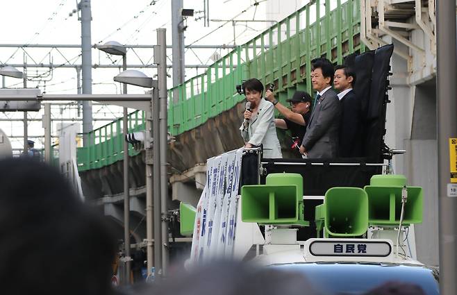 | ▲ 9월 24일 오후 일본 도쿄 아키하바라역 근처에서 열린 집권 자민당 총재 선거 연설회에서 다카이치 사나에 전 경제안보담당상이 지지를 호소하고 있다. |