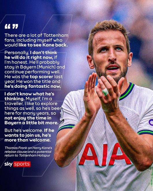 프랭크 감독은 케인의 복귀설에 대해 "케인의 복귀를 바라는 토트넘 팬들이 많이 있다. 나도 포함이다. 솔직히 말하자면 개인적으로는 지금 당장 그가 돌아오진 않을 것 같다. 그는 아마 바이에른에 머물면서 계속해서 좋은 성적을 거둘 거다. 케인은 작년에 분데스리가 득점왕이었고, 우승을 차지했다. 지금도 환상적인 활약을 펼치고 있다"라고 말했다.