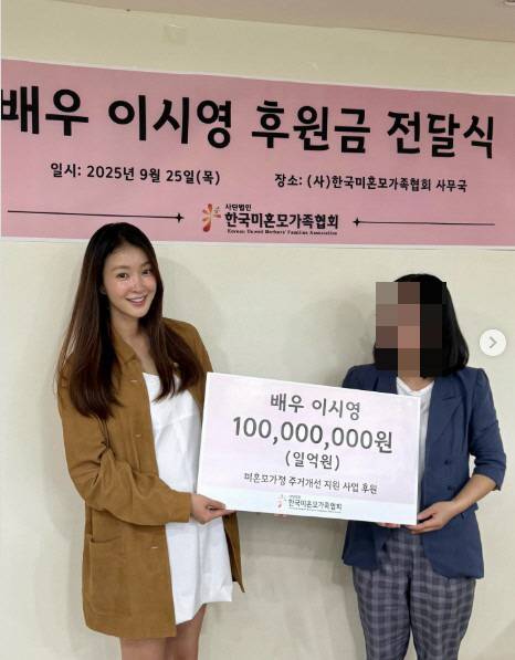 배우 이시영이 한부모 가정을 위해 1억 원의 후원금을 전달했다.