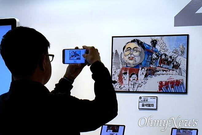 윤석열차를 보러 축제를 찾았다는 이아무개(20대 남성)씨는 "직접 보니 신기하다"며 "윤석열 얼굴이 그려진 열차가 들이닥치자 시민들이 놀라 도망치는 모습이 그림에 담겨 있는데 나 같다는 생각을 했다"며 웃음을 보였다.