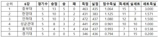 이로써 이미 4강을 확보한 성균관대는 3승2패, 승점 8로 최종 4위가 결정됐다. 중부대는 5승, 승점 13으로 1위를 차지했으며, 한양대가 3승2패, 승점 10로 2위를 기록했다. 한양대와 똑같은 3승2패, 승점 10을 기록한 인하대는 점수 득실에서 뒤져 3위에 머물렀다.
