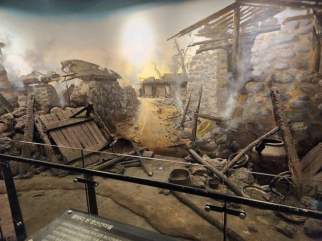 | ▲ 전시실에 전시된 사진. 당시 불바다가 된 중산간마을의 모습이 처참하다. |