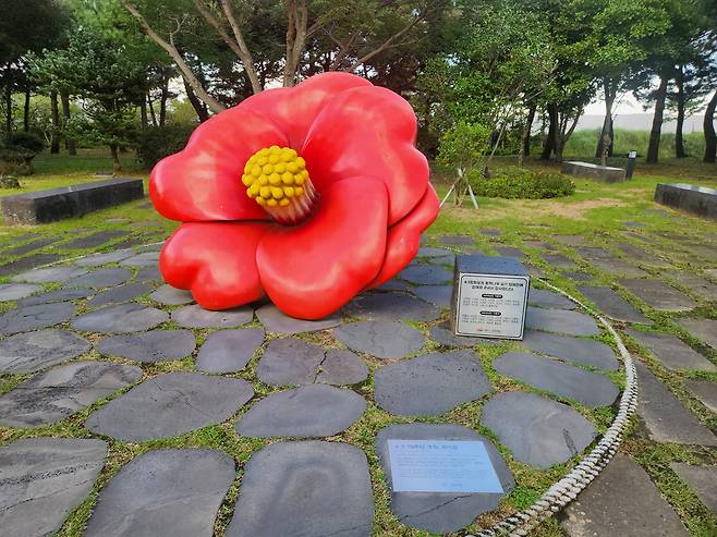 | ▲ 제주4·3의 상징꽃인 동백꽃 조형물. 붉은 동백꽃의 강렬한 이미지가 제주의 아픔을 말해주고 있는 듯싶다. |