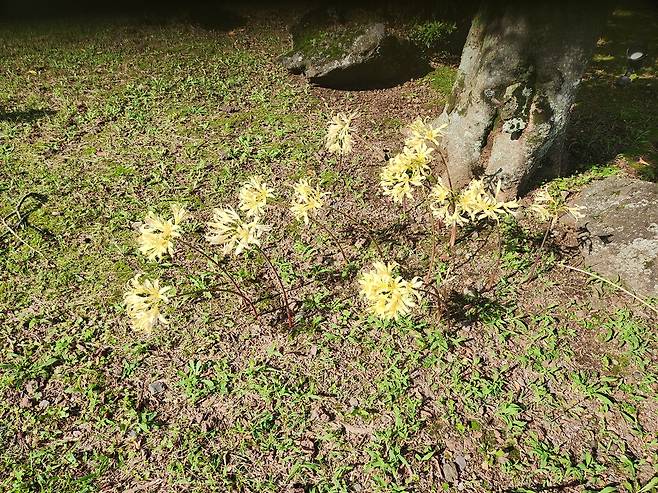 공원 화단에 예쁘게 핀 몇 송이 상사화도 마음이 끌린다. 잎과 꽃이 만나지 못해 서로를 그리워하는 상사화! 억울한 죽임을 당한 희생자들의 넋이 그리운 가족을 생각하고 있는 것 같아 마음이 애잔하다.