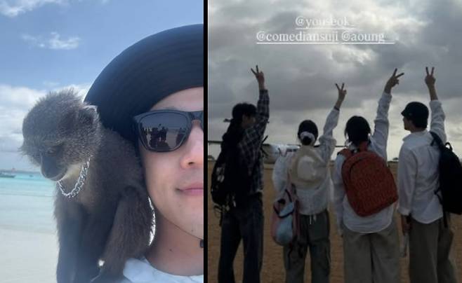 사진 속 정준원은 '슬기로운 의사생활'에서 호흡을 함께 맞췄던 배우 강유석을 비롯해 코미디언 이수지, 배우 김아영이 나란히 서서 하늘을 향해 손을 들어 올린 뒷모습이 담겨 있어 눈길을 끌었다. 다른 사진에는 이국적인 분위기가 풍겨지는 현지에서 원숭이와 함께한 투샷 모습이 담겨졌다.