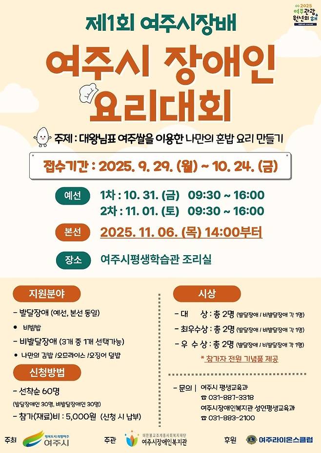 이번 대회는 '대왕님표 여주쌀을 이용한 나만의 혼밥 요리'를 주제로 열리며, 장애인들이 여주쌀을 활용한 요리를 직접 만들어보는 과정을 통해 자립 생활 능력을 키우고 평생학습의 기회를 실천하는 한편, 지역 농산물인 여주쌀의 우수성을 알리고 브랜드 가치를 높이는 데에도 의미가 있다.