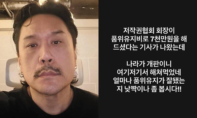 JK 김동욱은 26일 자신의 계정에 "저작권협회 회장이 품위유지비로 7,000만 원을 해 드셨다는 기사가 나왔다. 나라가 개판이니 여기저기서 해쳐 먹었다. 얼마나 품위유지가 잘 됐는지 낯짝이나 좀 보자"라는 글을 업로드했다.