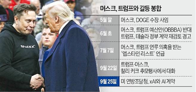 미국 정부가 일론 머스크 테슬라 최고경영자(CEO)가 운영하는 AI 스타트업 xAI로부터 AI 모델을 공급받는 계약을 맺었다. 그동안 갈등을 빚었던 도널드 트럼프 미국 대통령과 머스크가 AI를 계기로 손을 잡은 것이다. 하지만 머스크가 운영하는 테슬라는 트럼프 정부의 온실가스 규제 완화에 이의를 제기하는 등 양측이 전기차 정책을 두고는 여전히 충돌하는 모습이다.