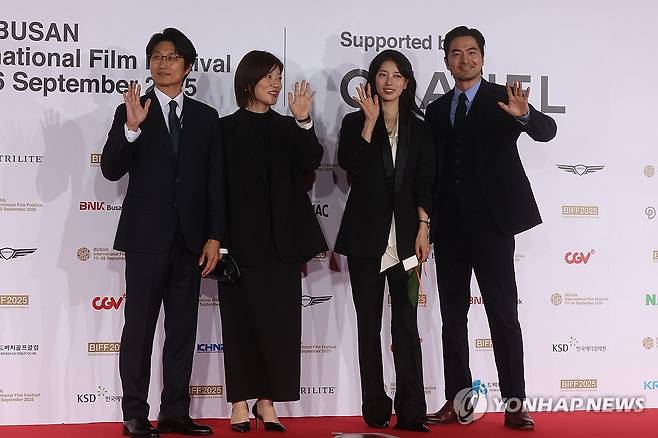 (부산=연합뉴스) 류효림 기자 = 이성진 프로듀서(왼쪽부터), 임선애 감독, 배우 수지, 이진욱이 26일 부산 해운대구 우동 영화의전당에서 열린 제30회 부산국제영화제 폐막식 레드카펫에서 포즈를 취하고 있다. 2025.9.26