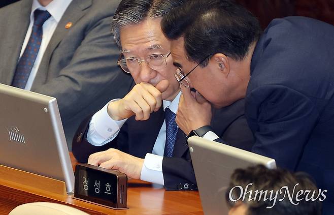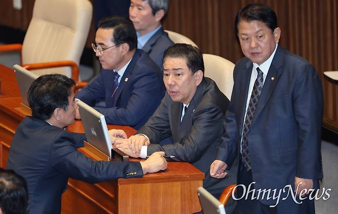 | ▲ '검찰청 폐지' 정부조직법 표결 앞둔 정성호 장관 26일 검찰청을 폐지하고 중대범죄수사청(중수청)과 공소청을 신설하는 내용을 골자로 하는 정부조직법 개정안 표결을 앞두고 국회 본회의장에서 정성호 법무부 장관이 박홍근 더불어민주당 의원의 이야기를 듣고 있다. |