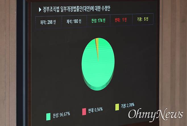 국회는 26일 오후 본회의장에서 검찰청 폐지와 수사·기소 분리 등을 골자로 한 '정부조직법 일부개정법률안(대안 수정안)'이 재석 의원 180인 중 찬성 174인, 반대 1인, 기권 5인으로 통과됐다.