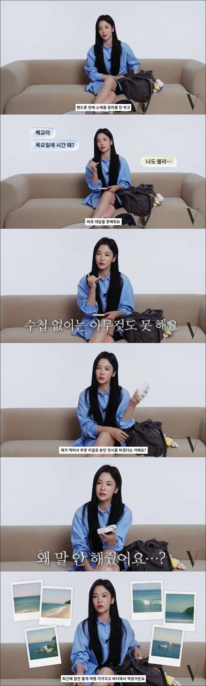 "어떤 사진이 있냐"는 질문에 송혜교는 "최근에 짧게 여행가서 바다에서 찍었다. 절대 주면 안 되겠다"고 밝혔다. 그러면서 "뭔가 당한 느낌이다"고 토로해 웃음을 안겼다.