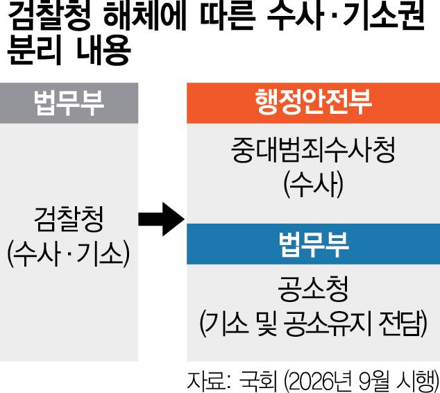 국회는 26일 본회의에서 검찰청 폐지와 중수청·공소청 신설 등을 담은 정부조직법 개정안을 통과시켰다. 이에 따라 1948년 창설된 검찰은 1년간의 유예기간을 거쳐 완전 해체된다. 수사 기능은 중수청으로, 기소 기능은 공소청으로 각각 이관된다. 중수청·공소청이 본격 가동되는 내년 9월 전까지 청사 확보와 인력 배치는 물론 형사소송법 개정 작업 역시 마무리해야 한다.