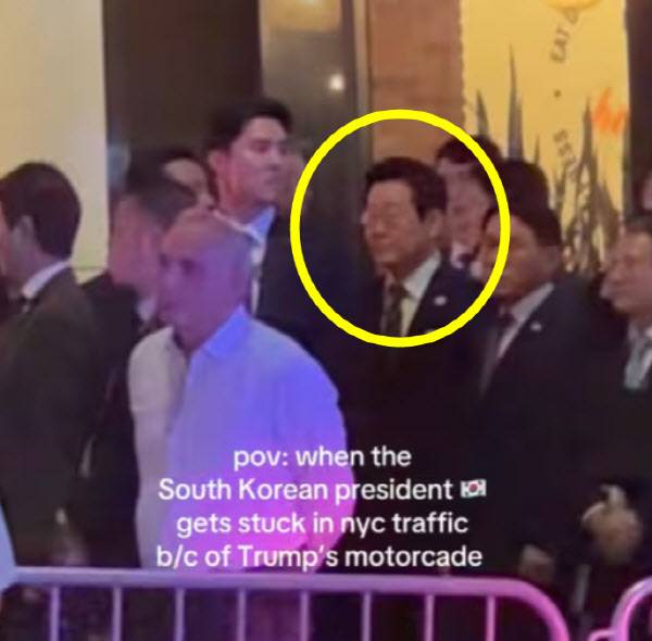 26일 사회관계망서비스(SNS)와 온라인을 중심으로 "트럼프의 의전 차량 행렬 때문에 한국 대통령이 뉴욕 도로에 발이 묶였다"는 설명과 함께 이 대통령이 경호원과 수행원에 둘러싸인 채 멈춰 선 모습의 영상이 퍼졌다.