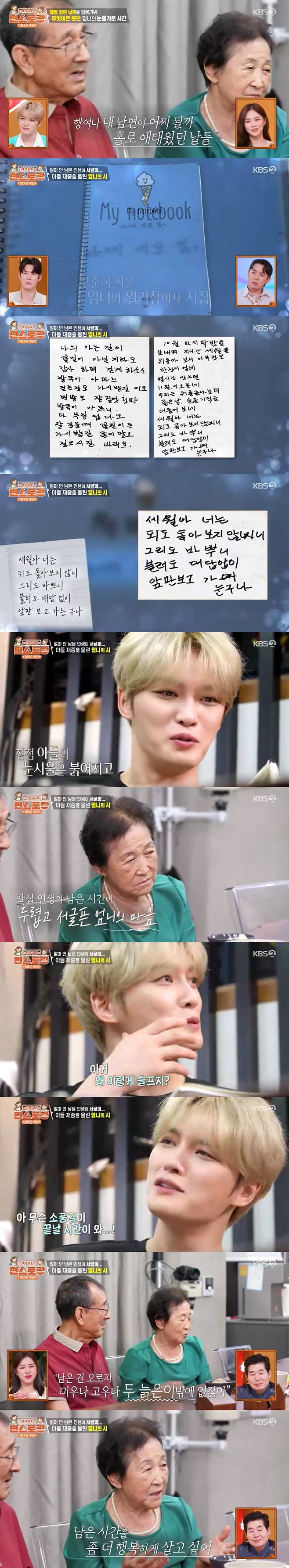 김재중은 어머니의 글을 읽으며 "엄마가 시를 쓰시는 줄 몰랐다. 처음 본다"고 감탄했고, 삐뚤빼뚤한 손글씨와 맞춤법이 틀린 문장 속에서도 진심이 전해지자 끝내 눈물을 흘렸다.