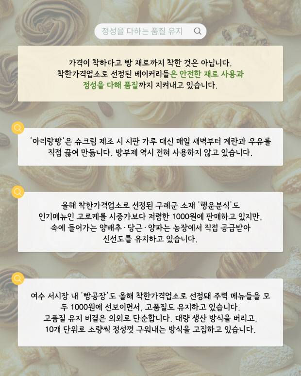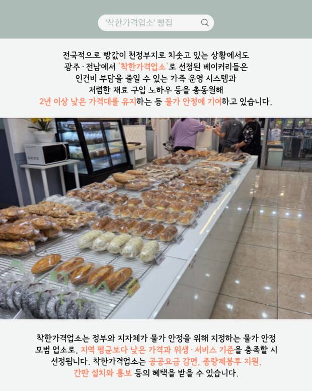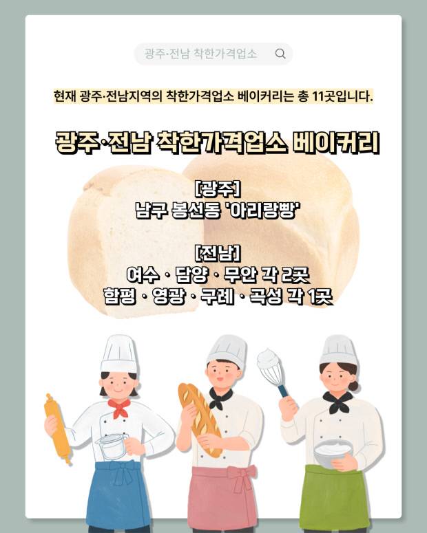 현재 광주·전남 지역의 착한가격업소 베이커리는 총 11곳으로, 광주에서는 남구 봉선동의 ‘아리랑빵’이 유일하며 전남은 여수 2곳, 담양 2곳, 무안 2곳, 함평·영광·구례·곡성에 각 1곳씩 총 10곳이 지정돼 있습니다.