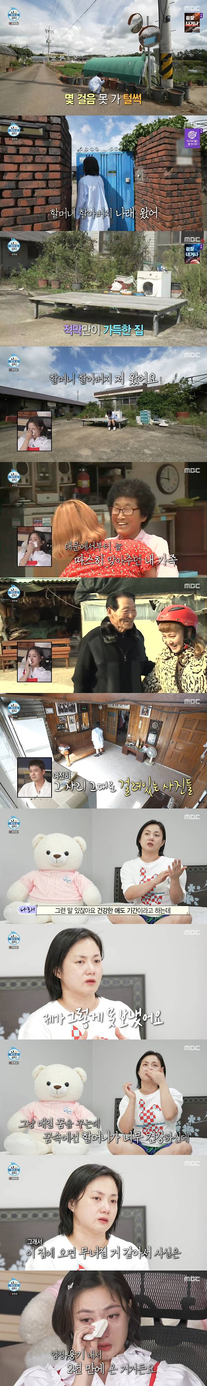 이어 박나래는 "할머니, 할아버지 나래 왔어요"라며 힘겹게 문을 열었다. 2년 만에 조부모님 댁을 찾은 것. 항상 박나래가 오면 언제나 따스하게 반겨주던 할머니, 할아버지의 모습 대신 무성하게 자란 잡초들이 텅 비어버린 시간을 말해줬다. "어떡해"를 되뇌이며 마당을 둘러보던 박나래는 우두커니 자리 잡은 평상에 앉아 고개를 떨궜다.