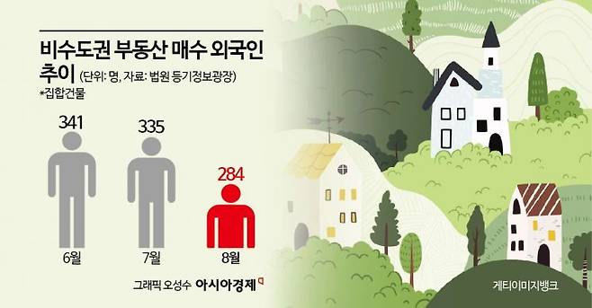 반면 비수도권 부동산을 사들이는 외국인의 수는 확 줄었다. 지난달 비수도권 집합건물을 사들인 외국인의 수는 284명으로 전월 335명과 비교할 때 15.2% 축소됐다. 올해 가장 많았던 지난 6월 341명 대비로는 16.7% 감소했다. 매수자 수가 280명대를 기록한 것은 6개월 만이다.