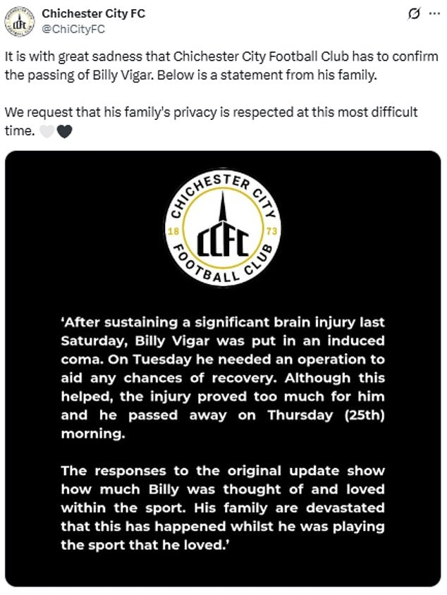 매체는 "축구계는 애도에 빠졌다. 비가르는 경기 중 끔찍한 부상을 입은 후 혼수상태에 빠졌다. 공을 잡으려다 콘크리트 벽에 부딪혔다. 소속팀 치체스터 시티는 비가르의 부고 소식을 알렸다"고 덧붙였다.