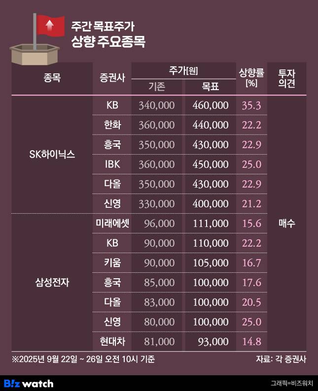 이번주 SK하이닉스와 삼성전자 목표주가가 다시 올랐다. SK하이닉스가 역사적 최고가(36만4000원)를 갈아치운 가운데 메모리 업황이 회복될 것으로 전망되면서 실적도 큰 폭으로 개선될 것으로 보인다.