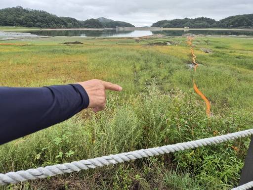 장현저수지의 17일 저수율도 매우 낮았다. 농촌용수종합정보시스템에 따르면 평년의 71.0%와 지난해 56.3%에 모자란 37.1%를 기록했다. 김씨가 손가락으로 가리킨 곳에는 물에 잠겨 보이지 않아야 할 풀들과 시가 인근 논으로 물을 대려 설치한 주황색 관로가 눈에 띄었다. 차로 10여분 거리에 있는 오봉저수지는 더 심각했다. 흙바닥이 넓게 드러나 저수지임을 알아보기조차 어려웠고, 급수차 정차 지점 표시를 위해 도로변에 세운 빨간 깃발들이 가뭄 흔적을 증언했다.