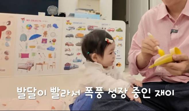 집에 돌아온 부부는 재이에게 바나나를 먹이는 모습을 보였다. 김다예는 쭈그려 앉았다가 벌떡 일어서서 바나나를 먹는 재이의 모습에 “이제는 쭈그려 앉는다”라며 “선생님이 발달이 빠른 편이라고 한다, 우리 재이가 잘 크고 있다”라고 흐뭇한 엄마의 마음을 드러냈다.