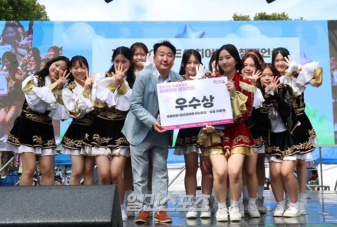 충북대학교 늘해랑이 청년의 날 치어리딩 챔피언십 우수상을 수상하고 청년과미래 정현곤 이사장과 함께 기념촬영을 하고 있다.