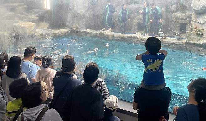 아쿠아리움 프로그램은 △생태설명회 △제주의 바다 △특별공연으로 구성돼 있다. '생태설명회'는 뒤뚱뒤뚱 펭귄, 달리는 수달, 춤추는 참물범, 하늘을 날다! 플라잉 퓅귄, 해녀 말함의 바당 이야기 등이 있는데 관람동선은 1층과 2층이다. '제주의바다'는 제주 해녀 물질 시연, 메인 수조 식사시간으로, 지하 1층 메인수조에서 진행됐다.