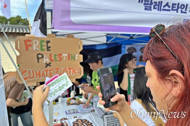 | ▲ 팔레스타인긴급행동 부스에서 한 외국인이 사진을 찍고 있다. |
