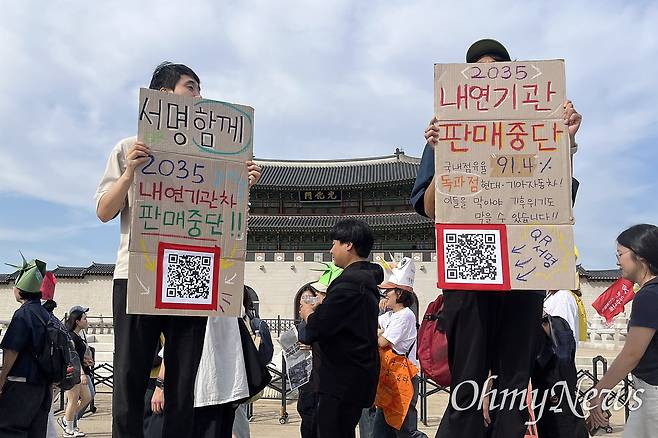 | ▲ 집회 참석자들이 "내연기관차 판매중단"이 적힌 피켓을 든 채 서명 참여를 요청하고 있다. |