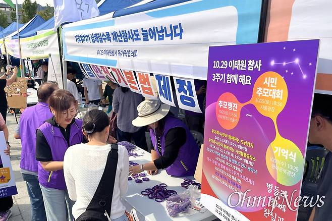 | ▲ 10.29 이태원 참사 유가족협의회의 부스에서 유족들이 시민들에게 보라색 팔찌를 나누고 있다. |