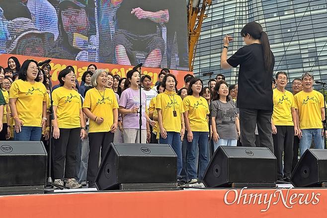 | ▲ 927기후정의합창단(평화의나무합창단, 여러모로합창단, 아는언니들, 지보이스, 종합예술단 봄날, 416합창단, 이소선합창단, 참여연대 참좋다, BTN으로 구성)이 집회 무대에서 소녀시대의 <다시 만난 세계> 등을 합창하고 있다. |