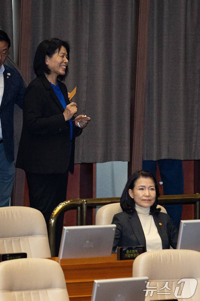 (서울=뉴스1) 유승관 기자 = 최민희 국회 과학기술정보방송통신위원장이 27일 서울 여의도 국회에서 열린 제429회 국회(정기회) 제9차 본회의에서 방송미디어통신위원회의 설치 및 운영에 관한 법률안(대안)에 대한 무제한토론(필리버스터) 종결동의의 건 투표를 마친 후 미소 지으며 이진숙 방송통신위원장 뒤를 지나고 있다. 2025.9.27/뉴스1