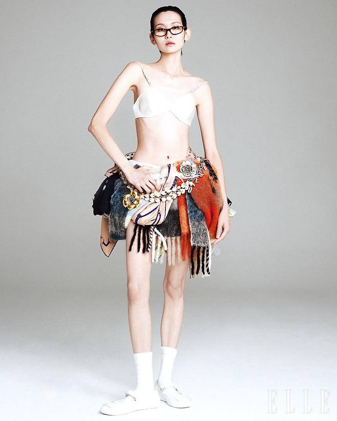 브라톱은 가격 미정, Miu Miu. 스커트로 레이어드한 블랙 티셔츠는 가격 미정, Balenciaga. 프린지 장식의 그레이 배색 체크 머플러와 베이지 배색 체크 머플러, 오렌지 배색의 체크 머플러는 51만원, 모두 Acne Studios. 베이지 스카프와 그린 스카프는 가격 미정, 모두 Gucci. 문 패턴의 저지 톱은 46만5천원, Marine Serre. 메탈 플라워 모티프 장식의 벨트는 31만원, La Manso by Adekuver. 벨트로 연출한 플라워 모티프 장식의 셸 네크리스는 가격 미정, Valentino Garavani. 이니셜 참 장식 체인 벨트는 가격 미정, Diesel. 벨트에 건 스페이드 모티프 블랙 로프 키 링과 레드 로프 키 링은 가격 미정, 모두 Bicycle. 메리 제인 슈즈는 가격 미정, Roger Vivier. 안경은 53만5천원, Miu Miu by EssilorLuxottica.