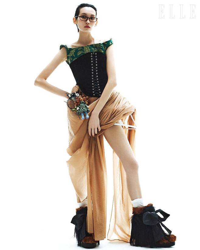 화이트 브라톱은 68만원, 플로럴 패턴의 코르셋은 84만원, 모두 Gyouree Kim. 레이어드한 블랙 코르셋은 가격 미정, Mark Gong. 드레이핑을 강조한 시스루 크리놀린은 가격 미정, Pushbutton. 보 장식의 부츠는 가격 미정, Valentino. 안경은 53만5천원, Miu Miu by EssilorLuxottica. 벨트는 19만8천원, Eenk. 블랙 캐릭터 참과 플라워 장식을 단 브라운 캐릭터 참은 가격 미정, 모두 Loewe. 그린 드레스를 입은 돌 참은 1백만원대, Fendi.