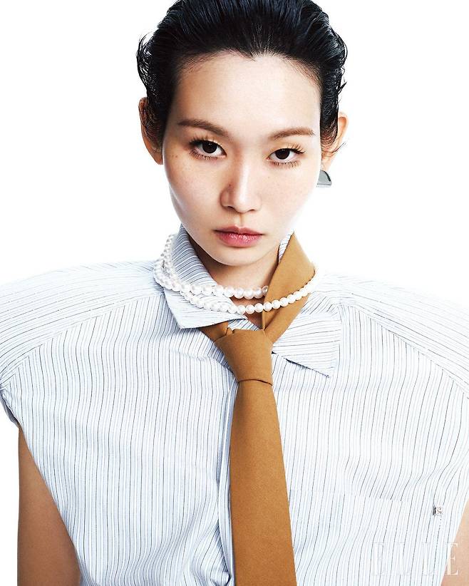 스트라이프 셔츠와 브라운 타이는 가격 미정, 모두 Wooyoungmi. 펄 네크리스는 29만5천원, N°21. 실버 이어링은 가격 미정, Courrèges.