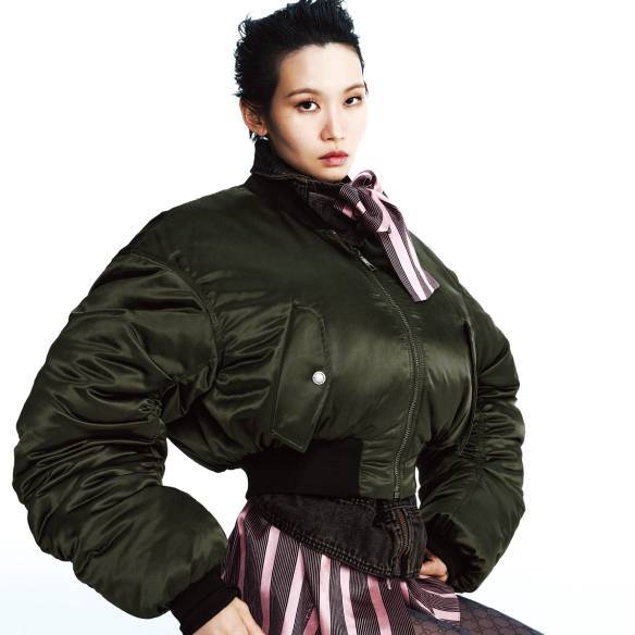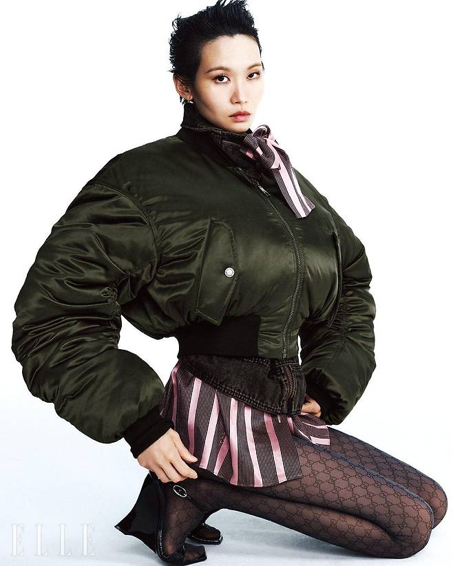 벌키하게 연출한 보머 재킷은 3백20만원, Dolce & Gabbana. 스카프 장식의 스트라이프 셔츠는 가격 미정, Valentino. 레이어드한 트러커 재킷은 24만9천원, Lorena Saravia H&M. 로고 스타킹은 가격 미정, Gucci. 웨지힐은 가격 미정, Diesel.
