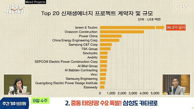 ◇ 최서윤> 아까 제가 말씀드린 그 상위 10개 사업 중에 74%가 태양광이라고 했잖아요. 재생에너지 사업에 어떤 기업들이 수주하고 있는지를 따져봤어요. 계약 규모로 상위 20개 기업 그래프를 띄워드릴게요. 이 중에 압도적인 1등은 인도 기업 라슨앤투브로에요. 2위는 이집트 기업 오라스콤 건설입니다. 중국이나 유럽 기업들도 있는데 한국 기업 중에서는 삼성물산이 5위, 삼성엔지니어링이 13위로 나오고 있어요.