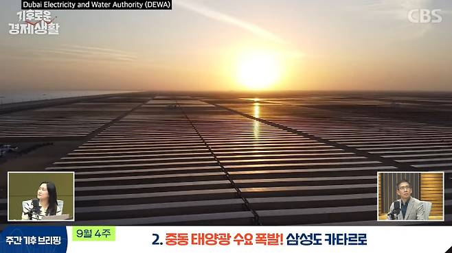 ◇ 최서윤> 맞습니다. 최근 변화 정말 흥미로워요. 중동 산유국들이 태양광에 엄청나게 투자하고 있고 한국 기업들도 파트너로 참여하고 있는 현상을 소개해 드리려고 합니다. 특히 삼성물산 건설 부문이 최근에 대형 수주를 따냈다는 소식이 있어서 이걸로 이야기를 시작해 볼게요.
