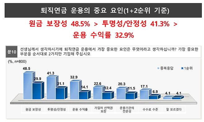 퇴직연금 운용에서 가장 중요한 요소를 묻자(복수응답) ‘원금 보장성’ 48.5%와 ‘투명성’ 41.3%이 꼽혔고 ‘수익률’은 32.9%로 그 뒤를 이었다. 수익률보다 원금 보장과 제도 운용의 투명성이 훨씬 우선 순위임이 드러났다. 이는 퇴직연금을 단순한 투자 수단이 아니라 노후의 안전망으로 보는 인식이 강하다는 의미다.