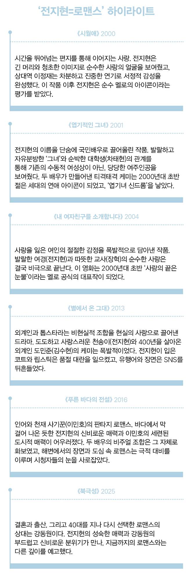 결혼과 출산 이후에도 달라지지 않은 건 바로 전지현의 로맨스 아이콘으로서의 위치였다. 오히려 시간이 쌓이며 만들어진 성숙함이 그녀의 연기에 깊이를 더했다. 나이와 상황은 변했지만, 여전히 전지현은 관객과 시청자를 설레게 하는 한국 로맨스의 얼굴이다.