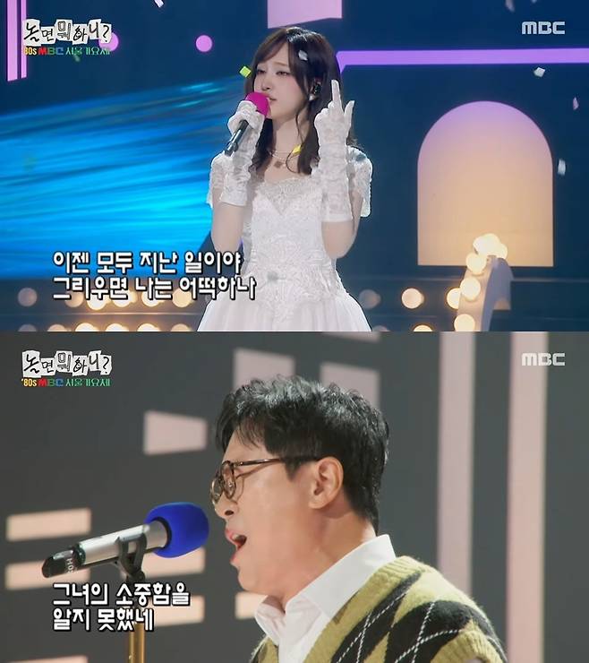 그런가 하면 아이브의 메인보컬 리즈는 그 시절 10대들의 우상이던 원곡 가수 이지연의 '바람아 멈추어 다오'로 청량감 있는 무대를 선사했다. 최근 역주행 인기로 전성기를 구가하는 우즈는 '마지막 콘서트'(이승철 원곡)로 록음악 못잖게 발라드에도 최적화된 보컬리스트임을 과시했다.