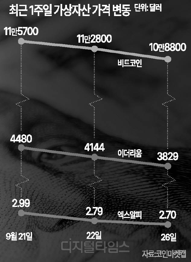 28일 코인마켓캡에 따르면 이날 오전 비트코인은 10만9600달러선에 거래되고 있다. 지난주보다 5% 이상 낮아진 가격이다. 이더리움도 10% 이상 하락했고 엑스알피와 솔라나도 각각 6%, 15% 약세다.