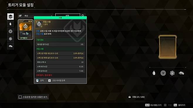신규 트리거 모듈은 '보급 요새', '파동 분출', '리듭 스텝'까지 총 3종이다. 보급 요새는 에이잭스와 카일 전용 모듈로 보호막이 대미지를 입으면 탄환을 얻고 적에게 반사 피해를 준다.