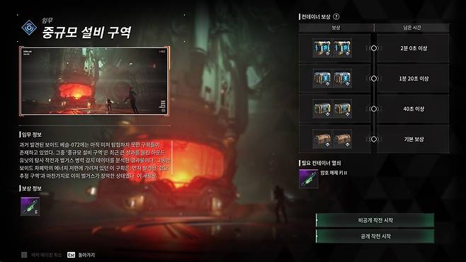 보상으로는 근접 무기 제작 재료와 스킬 성능을 강화하는 트리거 모듈을 획득할 수 있다. 또한 던전 곳곳에 배치된 보관함을 열면 추가 보상을 준다.