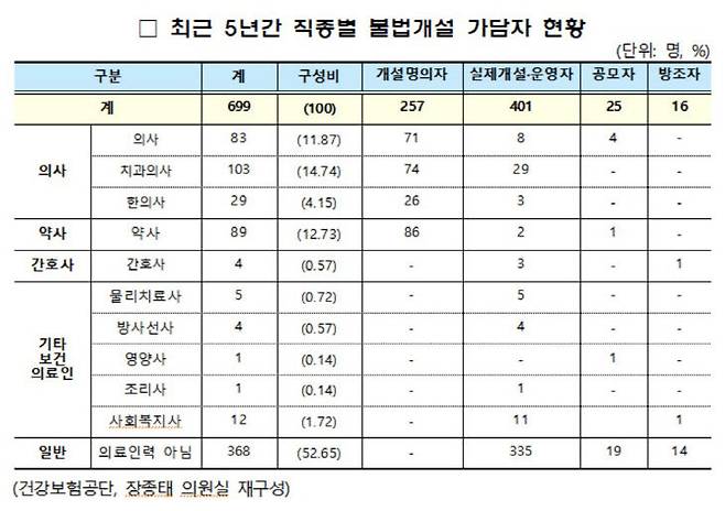 국회 보건복지위원회 더불어민주당 장종태 의원(대전 서구갑)이 28일 국민건강보험공단으로부터 제출받은 자료를 분석한 결과, 2020년부터 최근까지 5년간 불법개설에 가담한 인원은 모두 699명인 것으로 집계됐다.