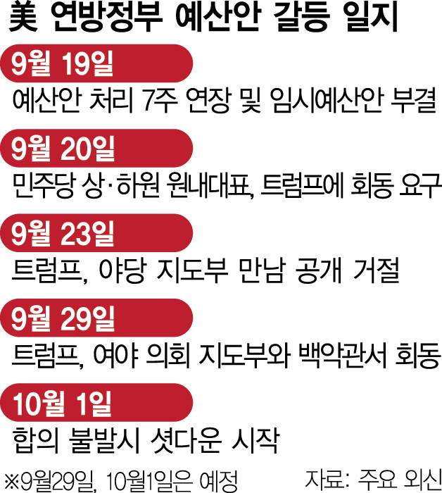 연방의회의 임시예산안(CR) 처리 실패로 다음 달 1일(현지 시간)부터 미국 행정부가 셧다운(일시적 업무정지)에 처할 위기에 빠진 가운데 도널드 트럼프 대통령이 29일 의회 지도부와 이 문제를 담판 짓기로 했다. 주요 외신들은 여야가 합의에 실패할 경우 백악관 주도의 연방공무원 대량 해고 등 초유의 상태가 벌어질 수 있다고 내다보고 있다.