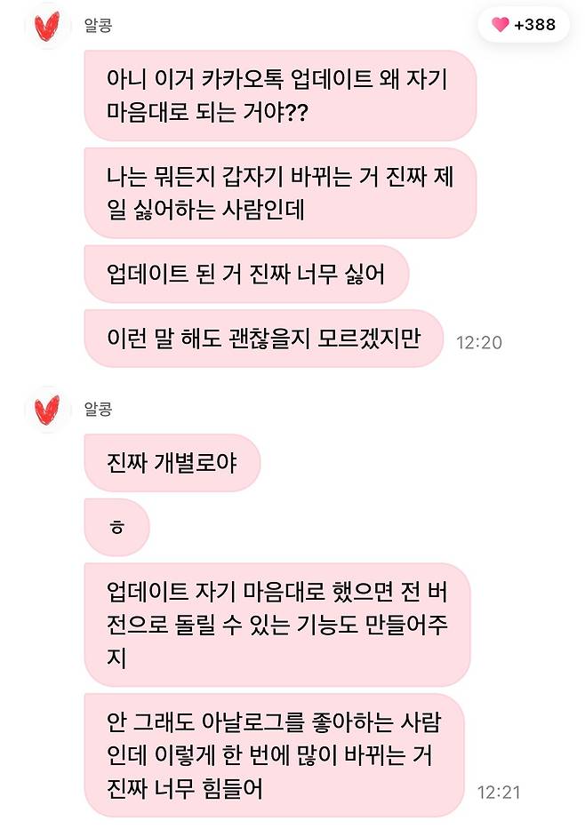 그는 "이런 말 해도 괜찮을지 모르겠지만 진짜 별로야. 업데이트 자기 마음대로 했으면 전 버전으로 돌릴 수 있는 기능도 만들어주지"라며 "안 그래도 아날로그를 좋아하는 사람인데 이렇게 한 번에 많이 바뀌는 거 진짜 너무 힘들어"라고 업데이트 이후 변화에 대해 솔직한 의견을 토로했다.