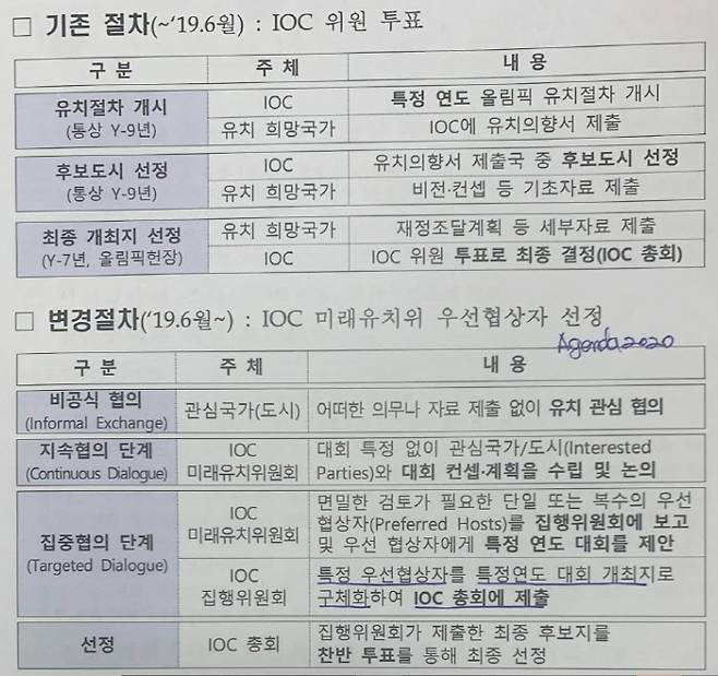전북올림픽 유치단 관계자는 "IOC 미래유치위원회와 지속적인 협의를 하면서 IOC의 요구와 기준을 적극 반영해 계획을 수정하고 조정해나가는 중이다. 개최 계획서도 IOC의 방향성에 맞게 수정중"이라고 했다. IOC는 아젠다2020에 따라 2019년부터 올림픽 개최지 선정 방식을 바꿨다. IOC 미래유치위원회가 올림픽 유치 희망도시와의 지속적, 단계적 협의 과정을 통해 유치도시를 결정한다. 첫 단계는 올림픽 유치에 대한 관심 표명, '비공식 논의' 단계다. 이 단계에서 해당 도시의 장기 발전 계획과 비전이 IOC와 부합할 경우에 한해 '지속 협의' 단계에 들어간다. 정기적 논의를 진행한 후 1개 또는 복수의 도시를 선정해 특정연도 개최를 목표로 '집중 협의'가 진행된다. 이후 IOC집행위원회가 올림픽 유치도시를 선별해 IOC총회에 상정하면 IOC총회에서 최종 개최도시를 투표로 선정한다. 현재 전주는 '지속 협의' 단계로 IOC와 격월로 논의를 진행중이다.